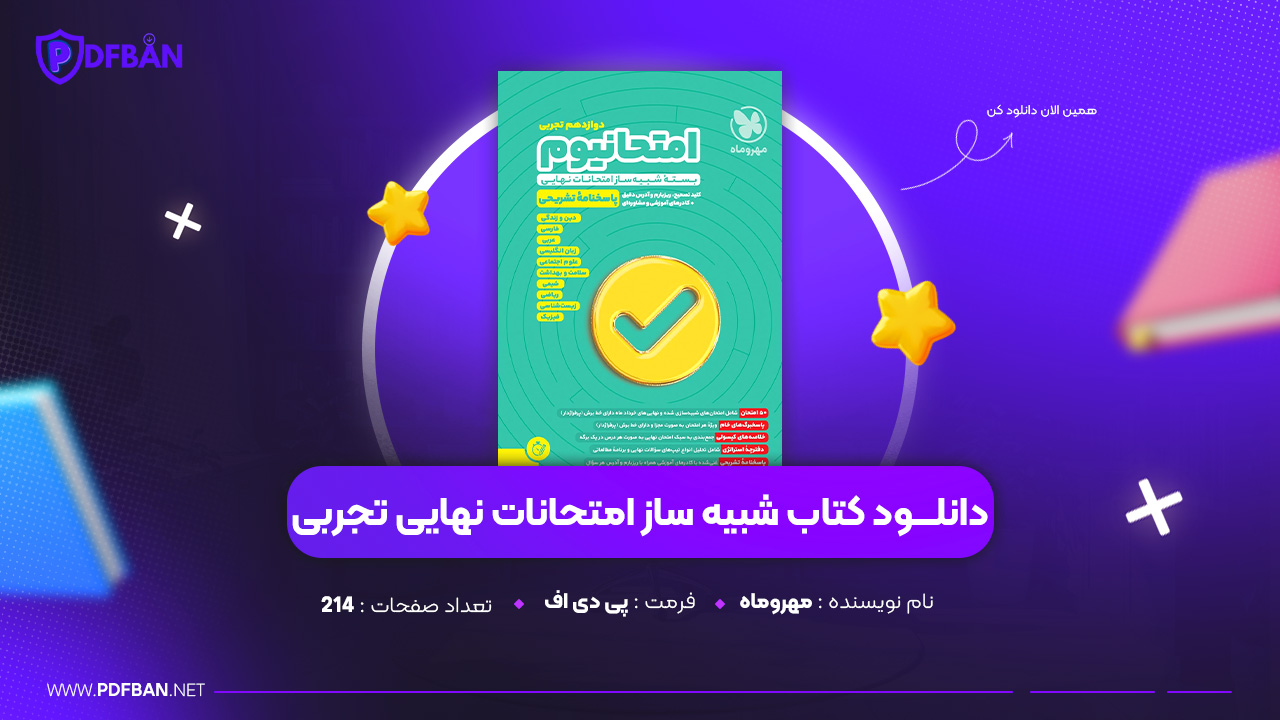 در این پست دانلود PDF کتاب شبیه ساز امتحانات نهایی تجربی مهروماه برای شما توسط سایت پی دی اف بان معرفی و ارائه شده است. کتاب شبیه ساز امتحانات نهایی تجربی مهروماه یکی از منابع آموزشی کاربردی و هدفمند برای دانشآموزان پایه دوازدهم رشته تجربی است که با هدف آمادگی کامل برای امتحانات نهایی طراحی شده است. این کتاب با بهرهگیری از ساختار آزمونمحور، مجموعهای از آزمونهای استاندارد و منطبق با بودجهبندی رسمی آموزش و پرورش را در اختیار دانشآموزان قرار میدهد. طراحی سوالات، سطح دشواری، چینش مباحث و پاسخنامههای تشریحی، همگی با دقت و وسواس علمی تنظیم شدهاند تا دانشآموز بتواند در فضایی مشابه آزمون واقعی تمرین کند و نقاط ضعف خود را شناسایی و برطرف نماید.