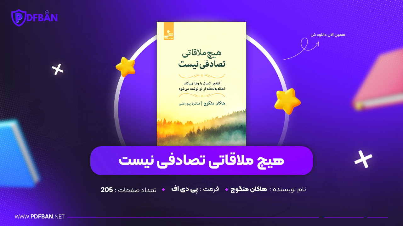 در این پست دانلود PDF کتاب هیچ ملاقاتی تصادفی نیست هاکان منگوچ برای شما توسط سایت پی دی اف بان معرفی شده است. کتاب “هیچ ملاقاتی تصادفی نیست” نوشته هاکان مگنوچ به عمق مفهوم تصادف و ارتباطات انسانی پرداخته و به خوانندگان این پیام را منتقل میکند که هر ملاقات و ارتباطی که در زندگی ما رخ میدهد، به نوعی معنا و هدف خاصی دارد و نمیتوان آن را صرفاً به عنوان یک تصادف ساده تلقی کرد. مگنوچ با نگاهی فلسفی و روانشناختی، به تحلیل این موضوع میپردازد که چگونه هر فردی که در زندگی ما وارد میشود، میتواند درسهایی برای ما به همراه داشته باشد و ما را در مسیر رشد و تحول شخصی یاری کند.